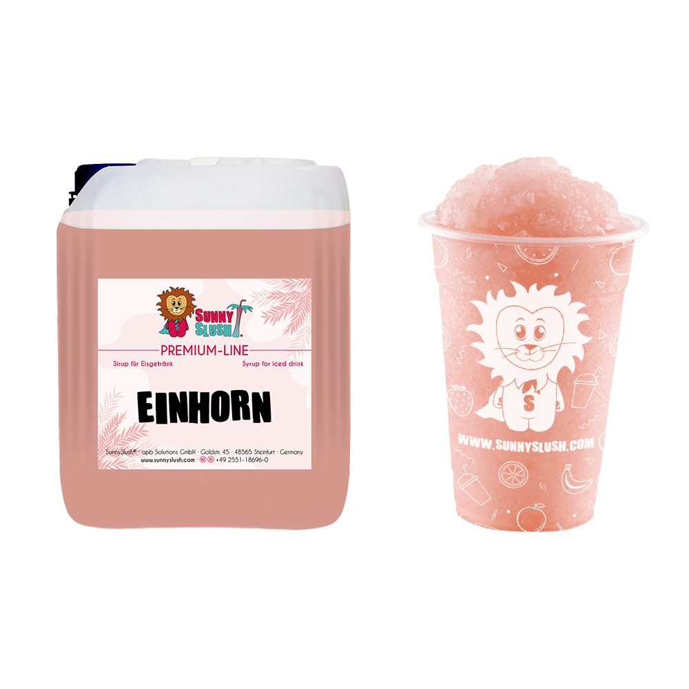 Der SunnySlush® Einhorn-Sirup 5 Liter (Premium-Line) verzaubert mit zartrosa Optik, leichtem Energy-Kick und intensivem Aroma. Der Premium Einhorn Slush Sirup ist vegan, glutenfrei und bei einem Mischverhältnis von 1:5 ergiebig für bis zu ca. 150 Portionen Slush-Eis à 0,2 Liter – perfekt für Kinderfeste, Themenpartys, Freizeitparks und Indoor-Spielplätze.