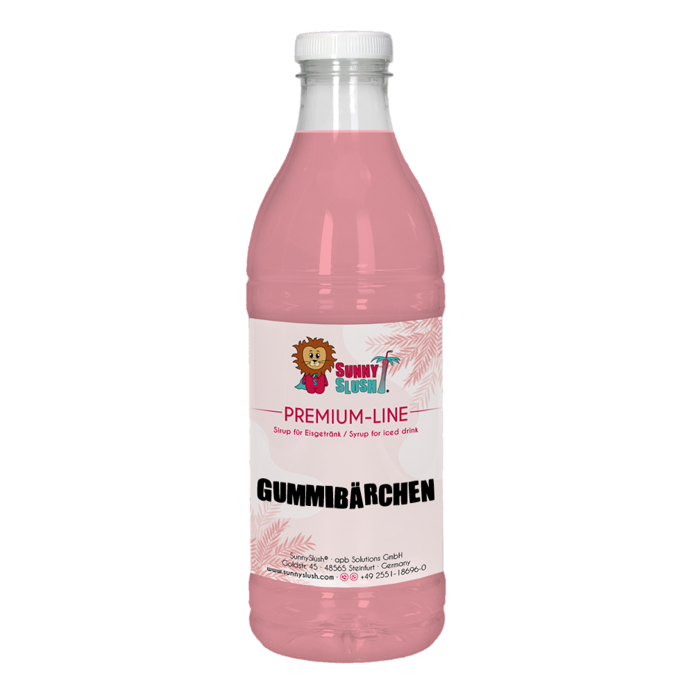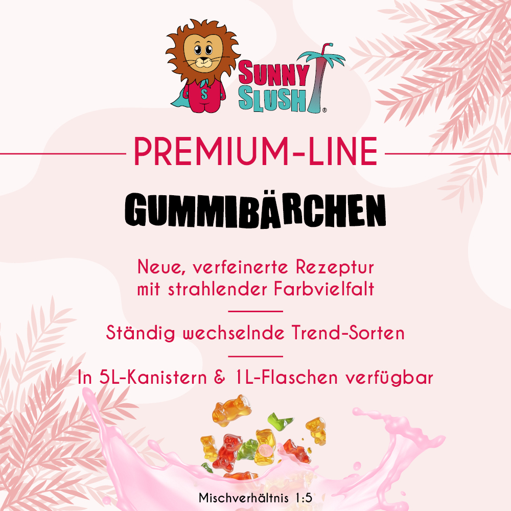 Die SunnySlush® Premium-Line steht für verfeinerte Rezepturen, strahlende Farbwirkung und kreative Geschmacksprofile. SunnySlush® Sirup – Gummibärchen 1 Liter (Premium-Line) interpretiert den beliebten Fruchtgummi-Klassiker als Slush-Sorte – mit verspielter Gummibärchen-Note und auffälligem Farbhighlight im Slush-Sortiment.