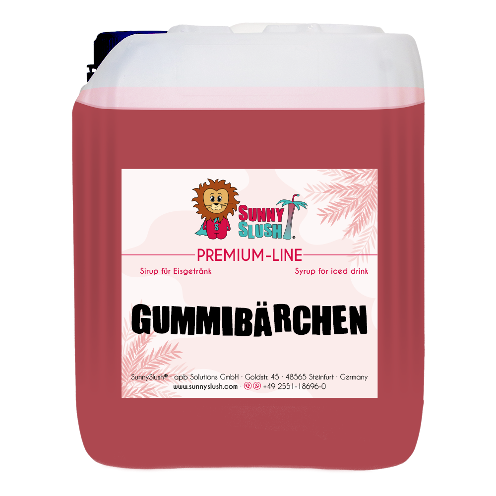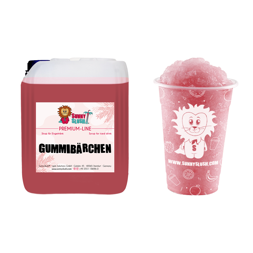 SunnySlush® Gummibärchen-Sirup 5 Liter (Premium-Line) bringt nostalgisches Süßwaren-Aroma und einen rosa Farbton in deine Slush-Theke. Die verfeinerte Premium-Rezeptur ist vegan, glutenfrei und auf den professionellen Einsatz in Slushmaschinen ausgelegt – ergiebig für bis zu ca. 150 Portionen Slush-Eis à 0,2 Liter.