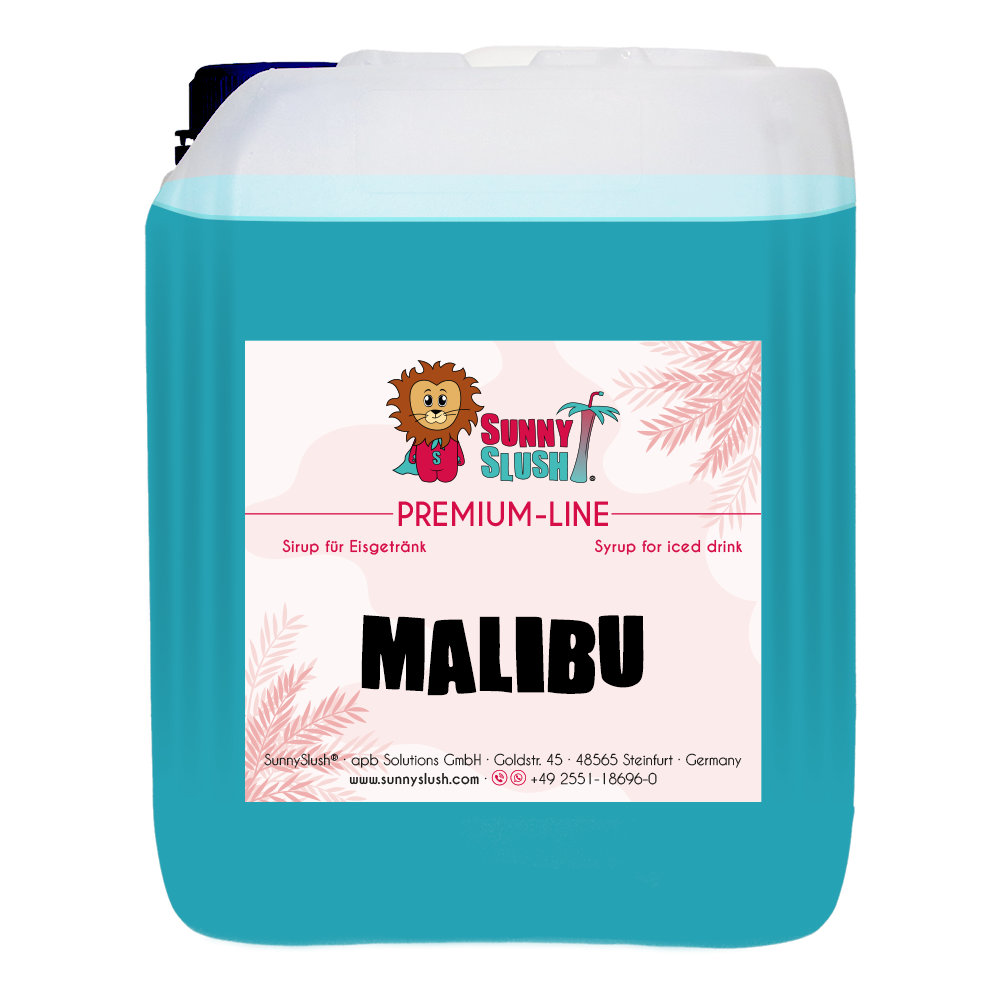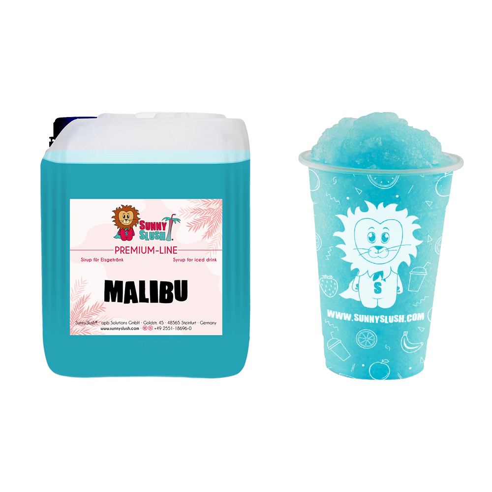 Der SunnySlush® Malibu-Sirup 5 Liter (Premium-Line) mixt exotische Blaubeer-Kokos-Fusion mit karibiktürkiser Optik im Slush-Becher. Der Premium Malibu Slush Sirup ist vegan, glutenfrei und bei einem Mischverhältnis von 1:5 ergiebig für bis zu ca. 150 Portionen Slush-Eis à 0,2 Liter – perfekt für Beachbar, Poolbar, Sommerfest oder Promotion-Stand.