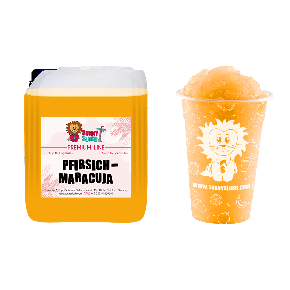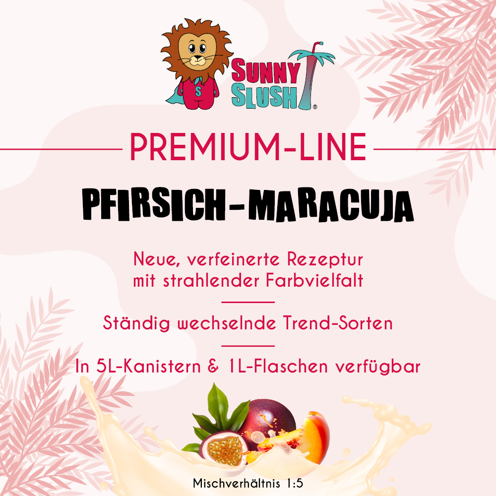 - ⪘ Auch als 1 L-Premium-Flasche: ideal für Probieraktionen, saisonale Specials & kleinere Slush-Maschinen – jetzt als SunnySlush® Pfirsich-Maracuja-Sirup 1 Liter (Premium-Line) entdecken
