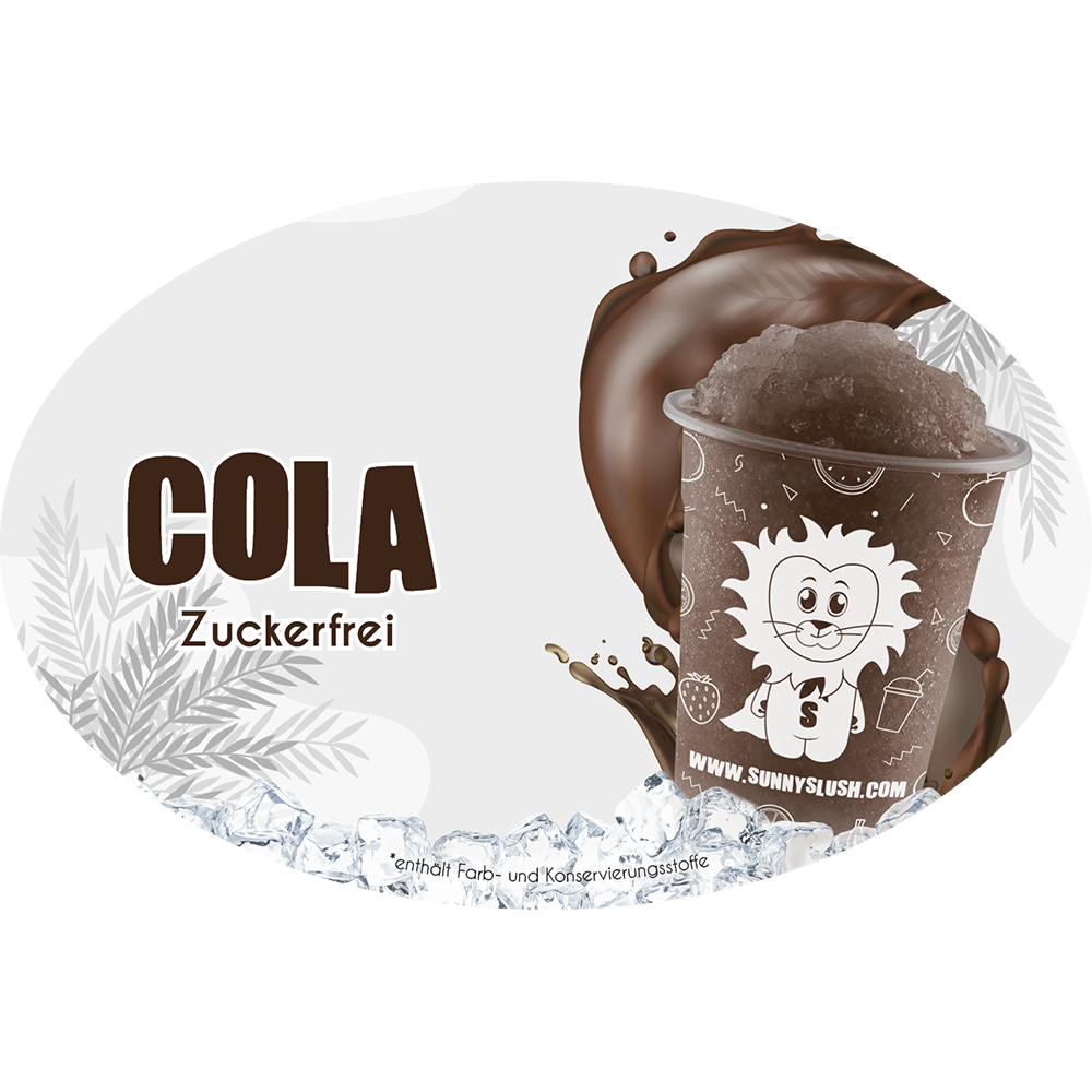 Der Sortenaufkleber – Cola (Zero-Line) von SunnySlush® kennzeichnet die zuckerfreie, kalorienreduzierte Zero-Line-Sorte