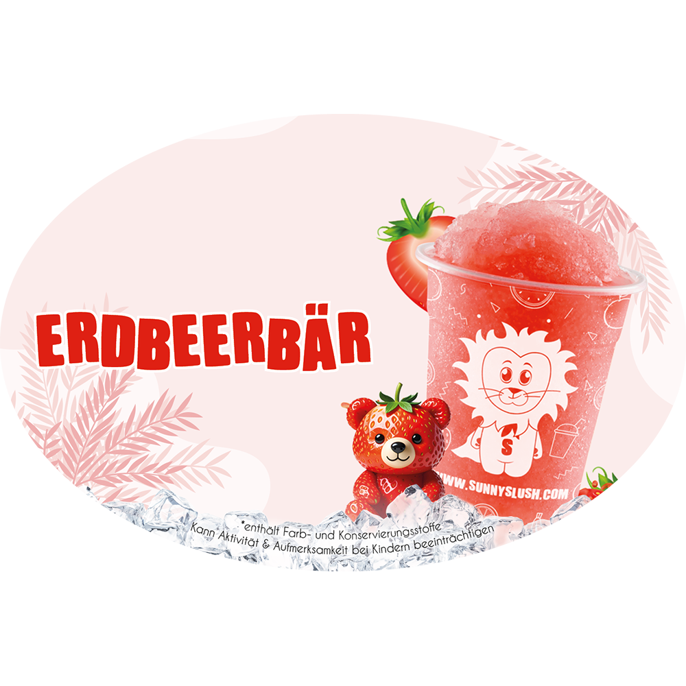 Der Sortenaufkleber – Erdbeerbär (Premium-Line) von SunnySlush® bringt die beliebte Premium-Sorte „Erdbeerbär“ direkt an den Slush-Tank.
