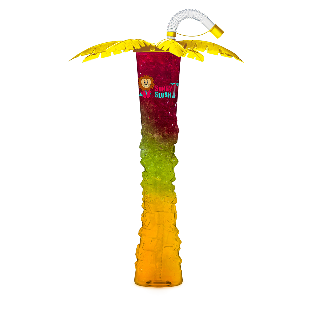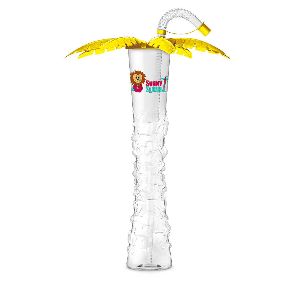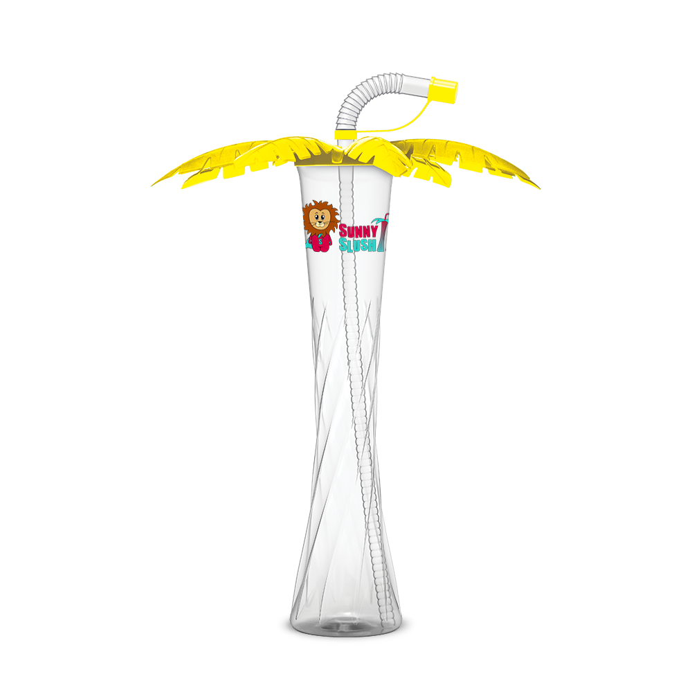 Sonnengelb strahlt der SunnySlush® Yard-Cup Premium Palme mit Logo und zieht alle Blicke auf sich – tropischer Klassiker mit hochwertigem Logo für 350 ml oder 500 ml erfrischenden Slush-Genuss.