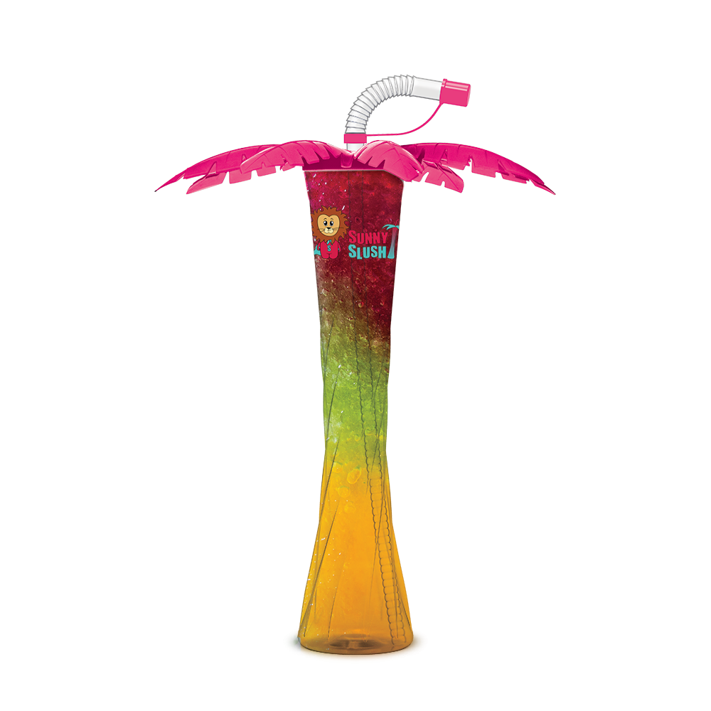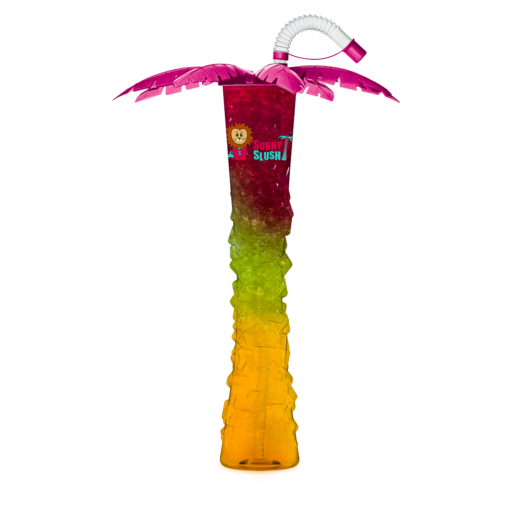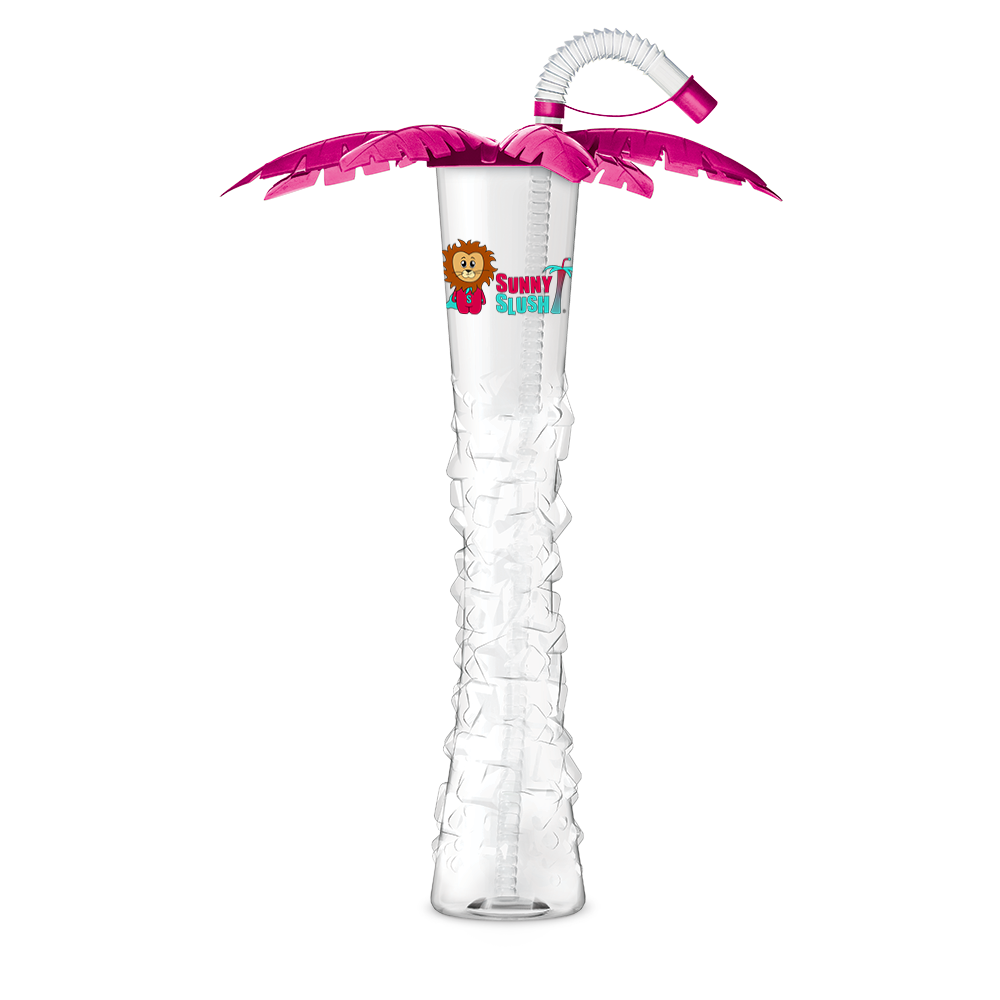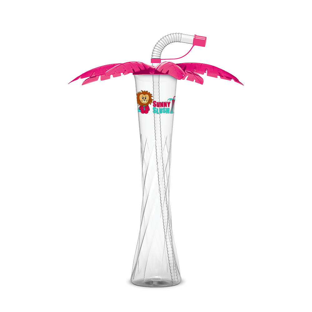Setze ein modisches Statement mit dem SunnySlush® Yard-Cup Premium Palme mit Logo in auffälligem Pink – tropischer Vibe trifft edles Logo-Design, perfekt für 350 ml oder 500 ml Slush-Genuss.